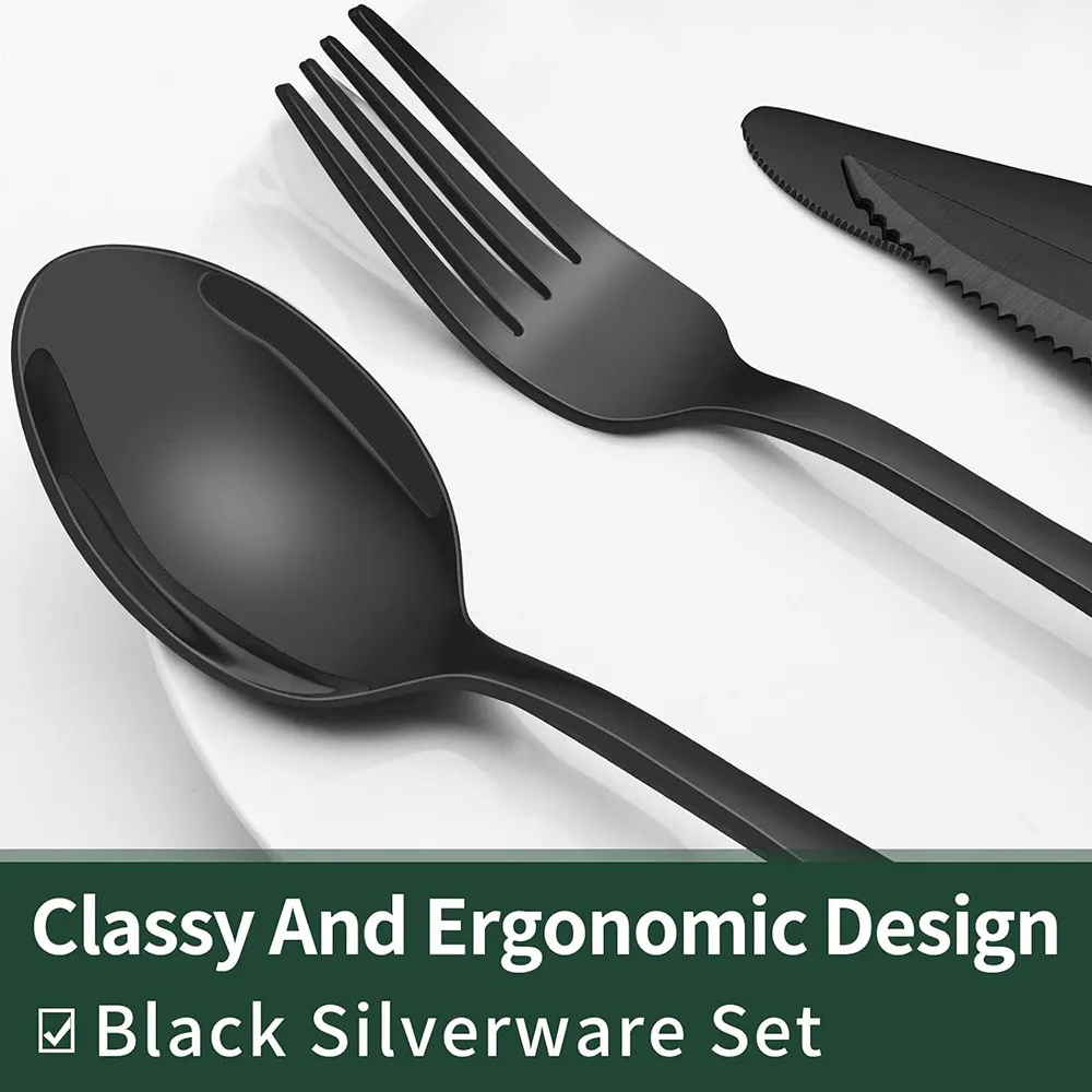 DESIGN CONFORTÁVEL: Este conjunto de talheres tem uma silhueta clássica com linhas limpas e superfície com acabamento polido em totalmente preto, uma boa opção para combinar com seus talheres existentes.A borda lisa da alça é agradável de segurar, o peso adequado e o equilíbrio perfeito são adicionados para garantir o máximo conforto durante o uso.
