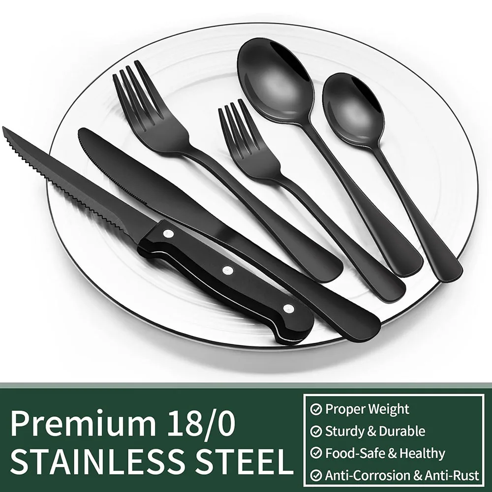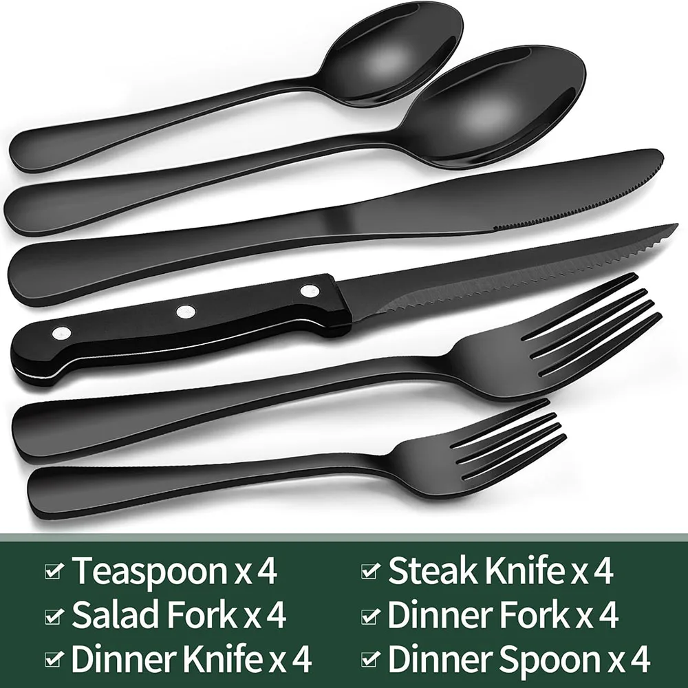 CONJUNTO PREMIUM DE SILVERWARE PRETO DE 24 PEÇAS PARA 4: Este conjunto de talheres contém 4 garfos de jantar, 4 garfos de salada, 4 colheres de jantar, 4 colheres de sobremesa, 4 facas de jantar e 4 facas de bife.É o conjunto ideal para uso diário doméstico e também para restaurantes, pubs, cafés e hotéis.Este conjunto de talheres também ajuda o seu jantar cheio de design enquanto faz uma festa.